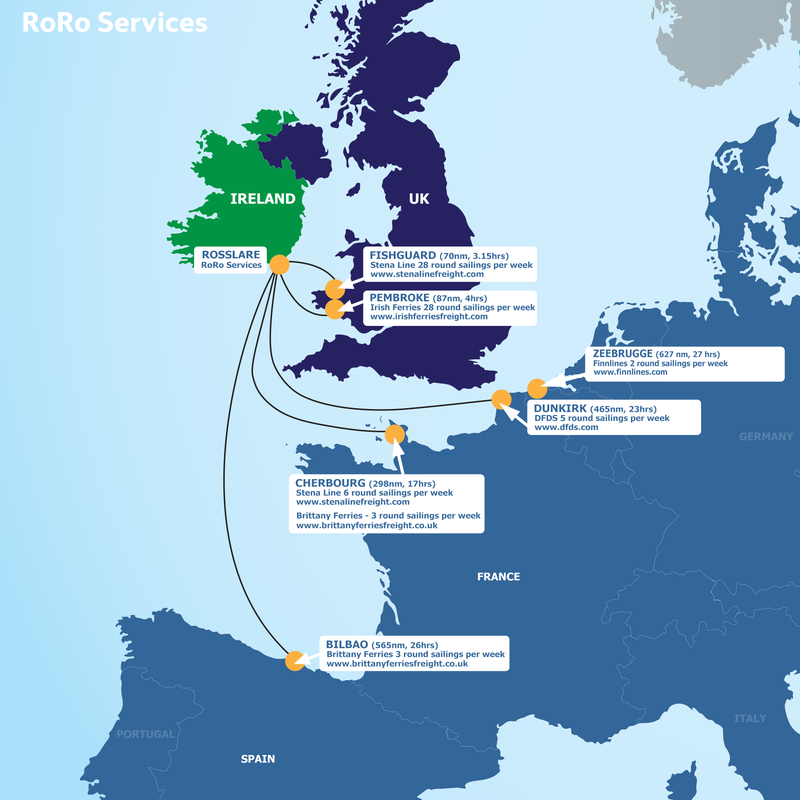 The below map shows the Freight routes and operators currently operating in and out of Rosslare Europort.